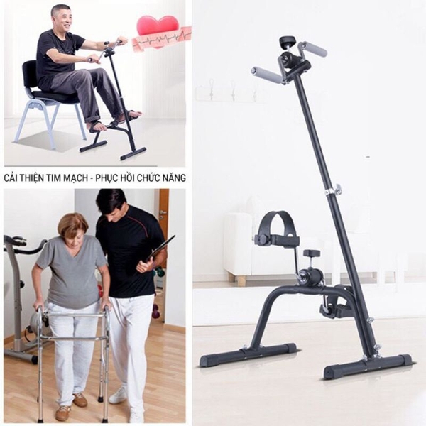 - Chức năng 1: Bộ phận đạp xe để tập mạnh cơ 2 chân, có nút điều chỉnh lực nặng, nhẹ cho phù hợp với sức cơ của từng người bệnh. Hai bàn chân được để trên 2 chiếc guốc có quai buộc vững chắc giúp người bệnh tập luyện dễ dàng.