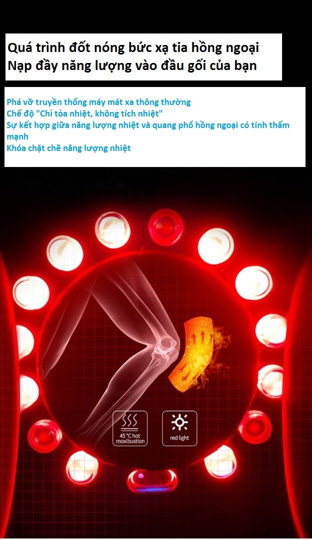Máy mát xa đầu gối pin sạc cao cấp ST-1101A sử dụng đèn hồng ngoại với bước sóng cao 615 ~ 650nm. Ánh sáng đỏ có thể chiếu xuyên sâu vào mô dưới da 10-15mm tạo ra hiệu ứng quan hóa làm tăng cường sức sống cho khớp gối, giúp đôi chân khỏe mạnh hơn.