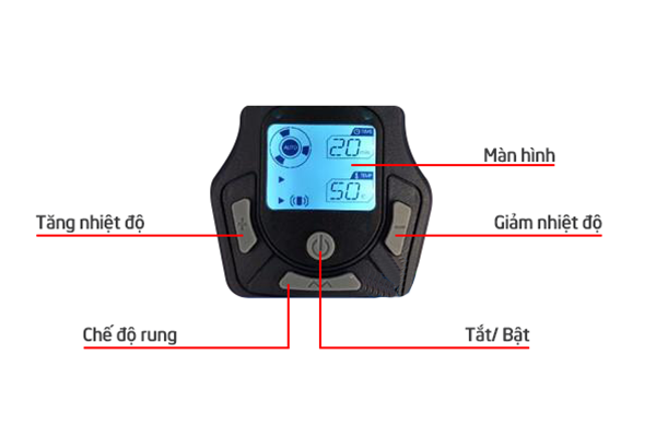 - Lựa chọn chế độ (I-II-III-IV): Sưởi ấm – Rung yếu – Rung mạnh – Rung tự động.