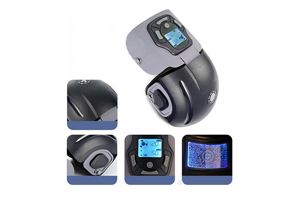 - Đeo máy mát xa lên đầu gối, bảng điều khiển hướng lên trên